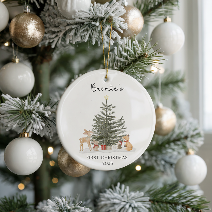 Personalised Baby's First Christmas Ornament 2025 - Premium Ceramic Woodland Design
