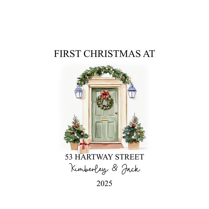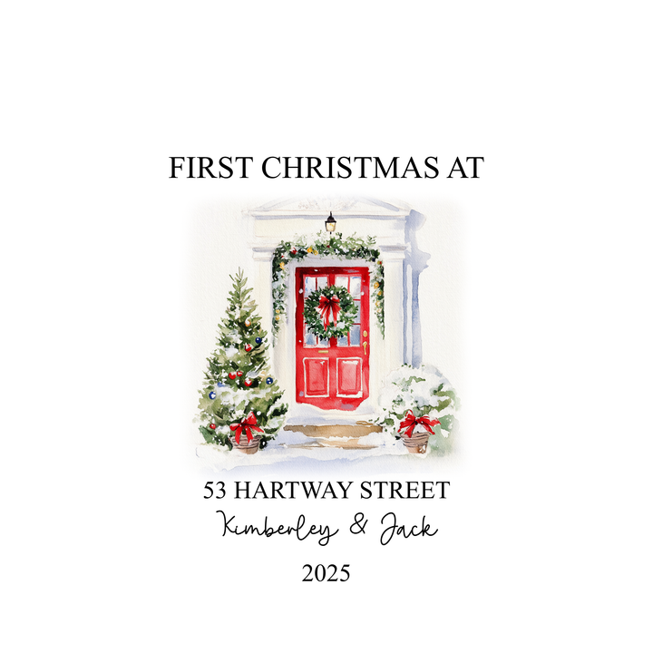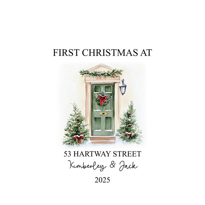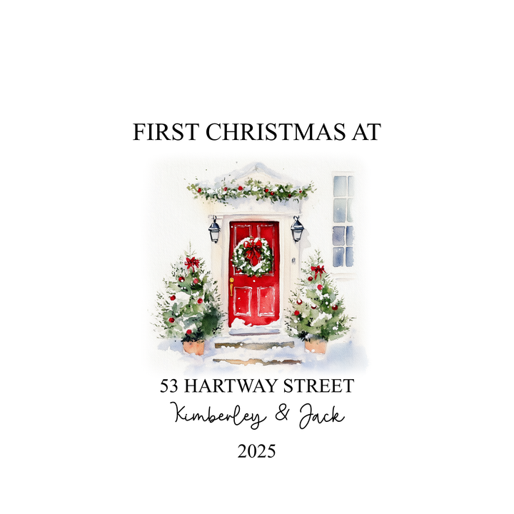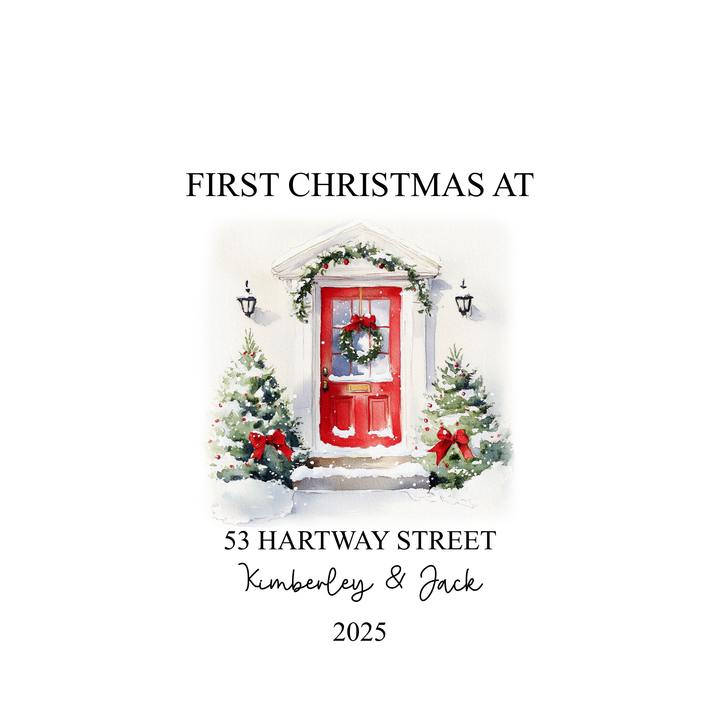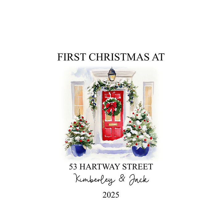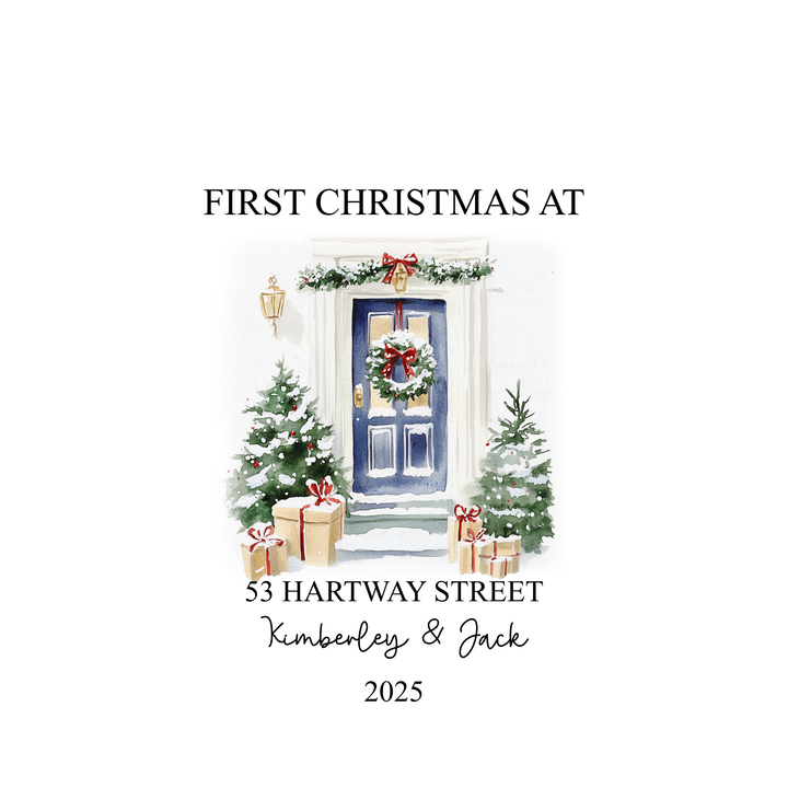 Mark a special milestone with this beautiful keepsake – your very first Christmas in your new home. This personalised ceramic ornament is custom printed with your street address, names, and the year 2025, all styled around a charming front-door festive design. It's the perfect way to capture the joy of a fresh start and turn your house into a home full of memories. Whether you're a newly married couple, first-time homeowners or celebrating moving into your dream house, this bauble is a thoughtful way to remember this chapter for years to come. Key Features: Personalised Design: Customise with...