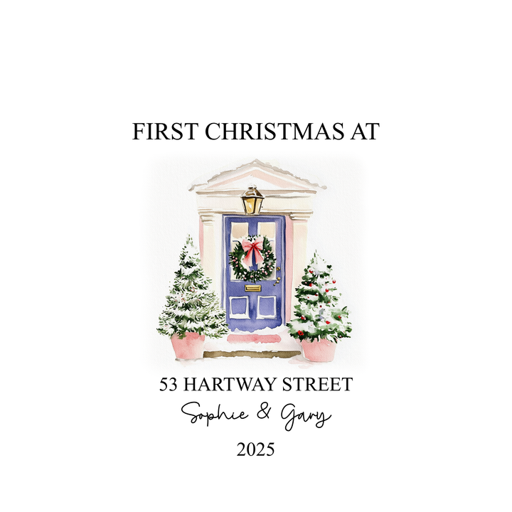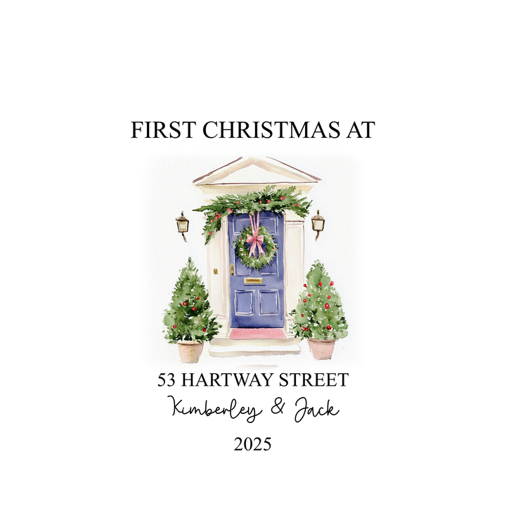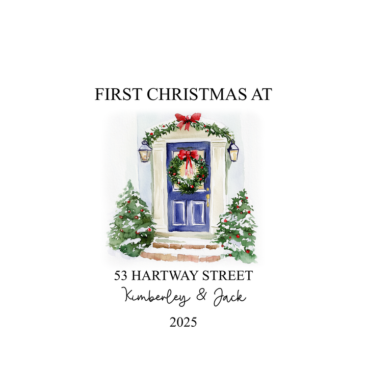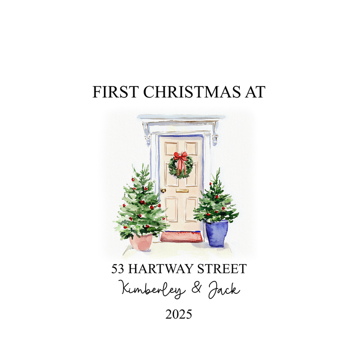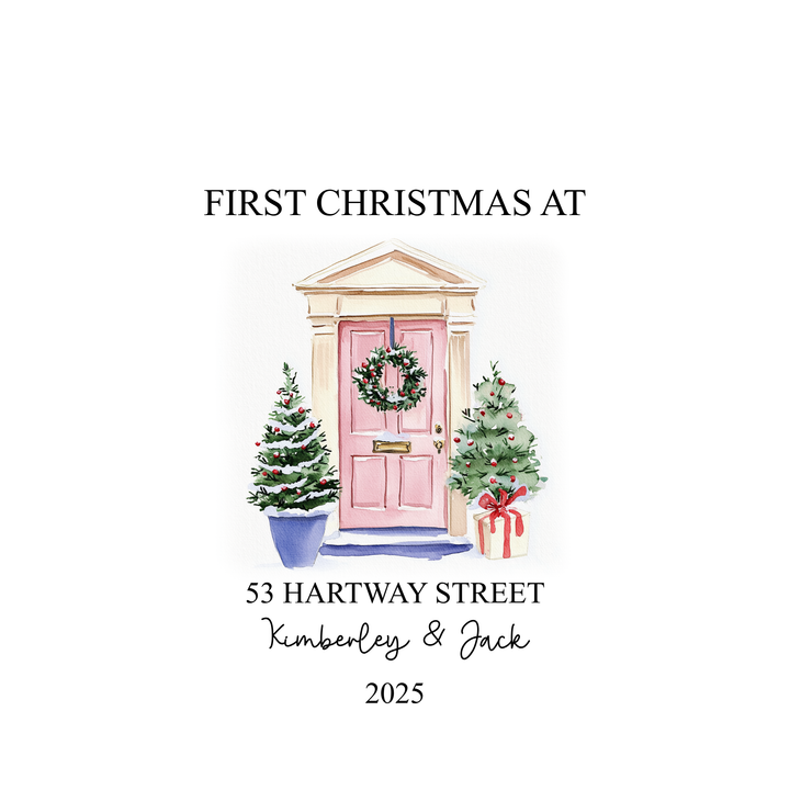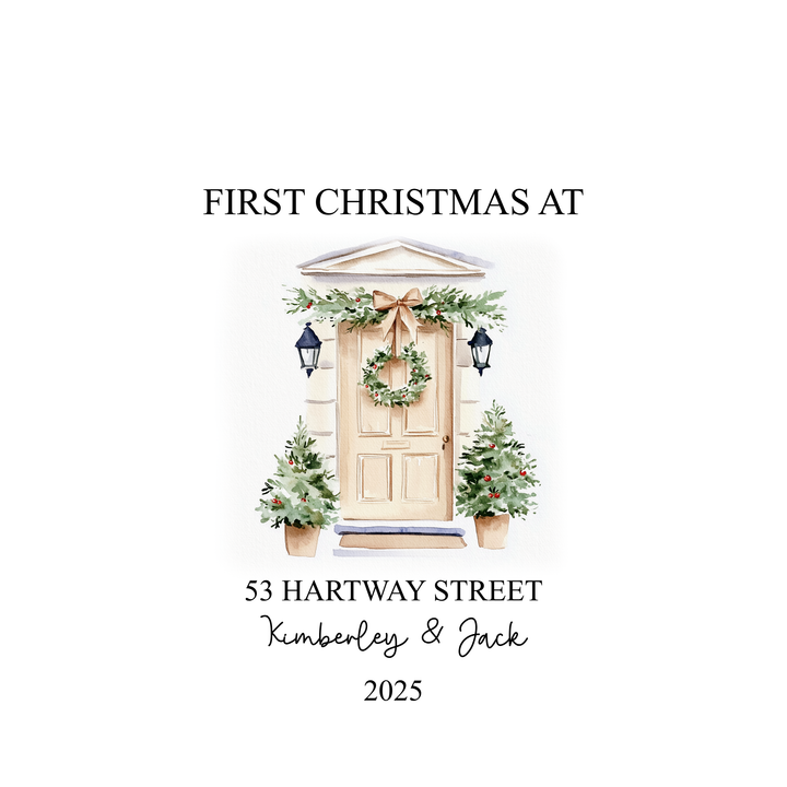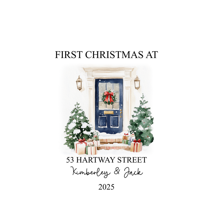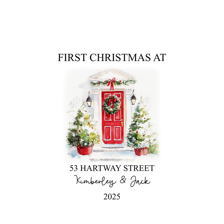 Mark a special milestone with this beautiful keepsake – your very first Christmas in your new home. This personalised ceramic ornament is custom printed with your street address, names, and the year 2025, all styled around a charming front-door festive design. It's the perfect way to capture the joy of a fresh start and turn your house into a home full of memories. Whether you're a newly married couple, first-time homeowners or celebrating moving into your dream house, this bauble is a thoughtful way to remember this chapter for years to come. Key Features: Personalised Design: Customise with...